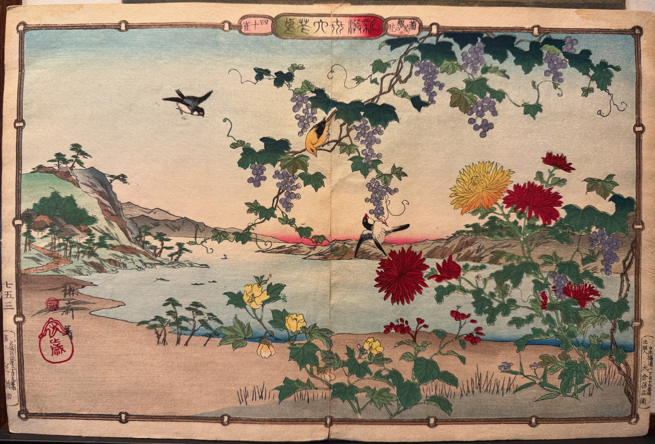 plis médian, estampe collée sur papier de murier,aux coloris éclatants de fraicheurs.