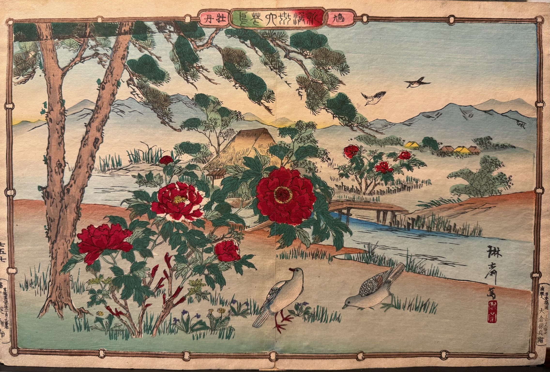 plis médian, estampe collée sur papier de murier,aux coloris éclatants de fraicheurs.