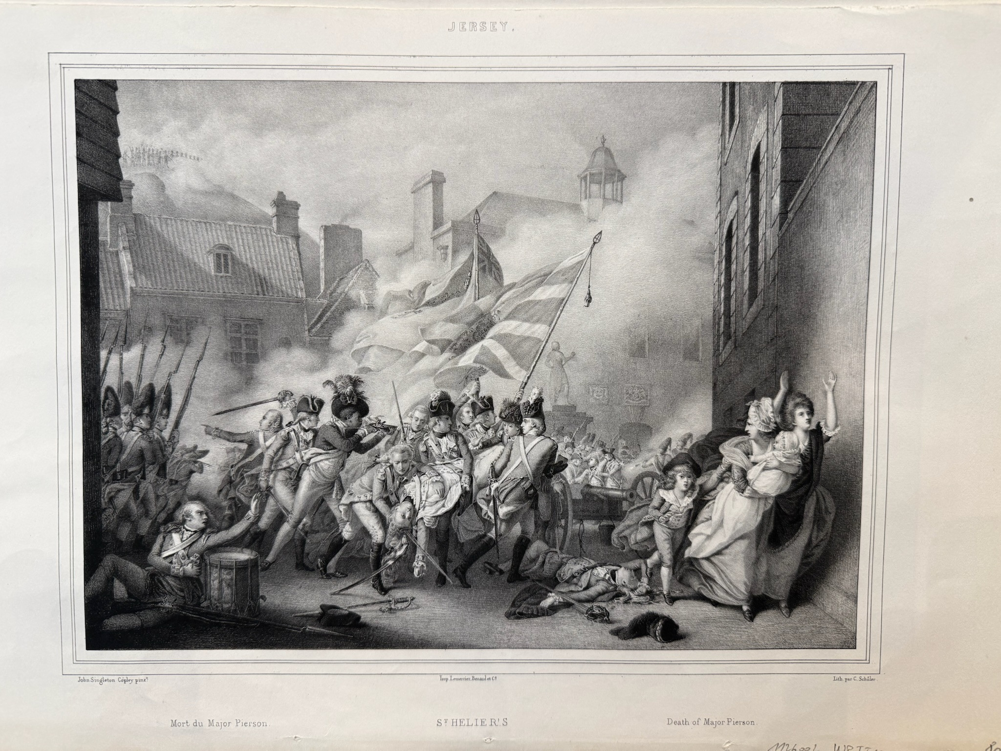 Lithographie originale représentant la Bataille de St Helier, mort du Major Pierson.